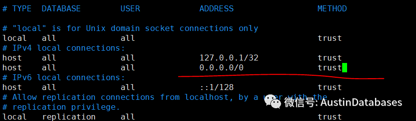 则最低的保障是需要系统在非主机登陆时,提供账号密码的验证,由于上面pg_hba的设置,导致任何人在任何时候,不使用任何密码都可以登陆到数据库中。