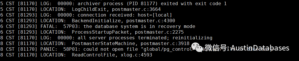 具体这样的操作的失败的原因,是检查点的位置保存在文件pg_control中。因此,在恢复开始时,服务器首先读取pg_control,读取检查点记录,通过从检查点记录中指定的日志位置向前扫描来执行重做操作。所以在删除了pg_control后,首先检查点的checkpoint的工作就无法进行下去了。整体的数据库系统就无法继续工作,导致系统崩溃。