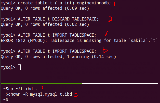 笔者在操作的时候使用的账号不是 MySQL 账号,导致第 4 步在引入表空间的时候提示表空间不存在,修改文件属主再重新导入就可以了。提醒大家还是要沉着,不要忙中出错。