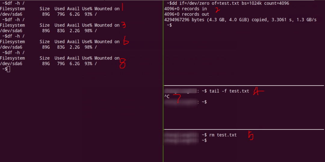 一个文件在文件系统中的存放分为两个部分:数据部分和指针部分,指针位于文件系统的 meta-data 中,数据被删除后,这个指针就从 meta-data 中清除了,而数据部分存储在磁盘中,数据对应的指针从 meta-data 中清除后,文件数据部分占用的空间就可以被覆盖并写入新的内容,之所以出现删除 test.txt 文件后,空间还没释放,就是因为 tail -f 进程还在一直打开这个文件句柄,文件对应的指针部分由于进程锁定,并未从 meta-data 中清除。由于指针并未被删除,那么系统内核就认为文件并未被删除,因此通过 df 命令查询空间并未释放。