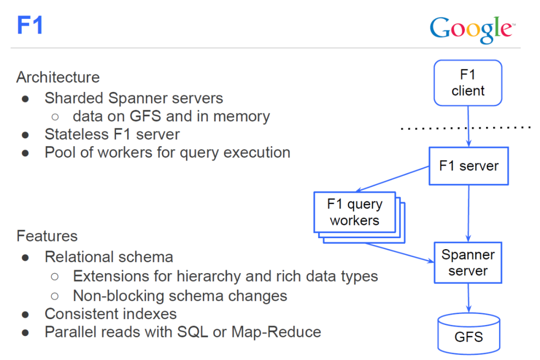 和众多互联网公司一样,在早期 Google 大量使用了 Mysql。Mysql 是单机的,可以用 Master-Slave 来容错,分区来扩展。但是需要大量的手工运维工作,有很多的限制。因此 Google 开发了一个可容错可扩展的 RDBMS——F1。和一般的分布式数据库不同,F1 对应 RDMS 应有的功能,毫不妥协。起初 F1 是基于 MySQL 的,不过会逐渐迁移到 Spanner。