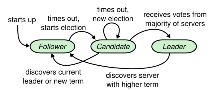 Candidate 收到大多数节点的选票则转换为 Leader;发现 Leader 或者收到更高任期的请求则转换为 Follower;