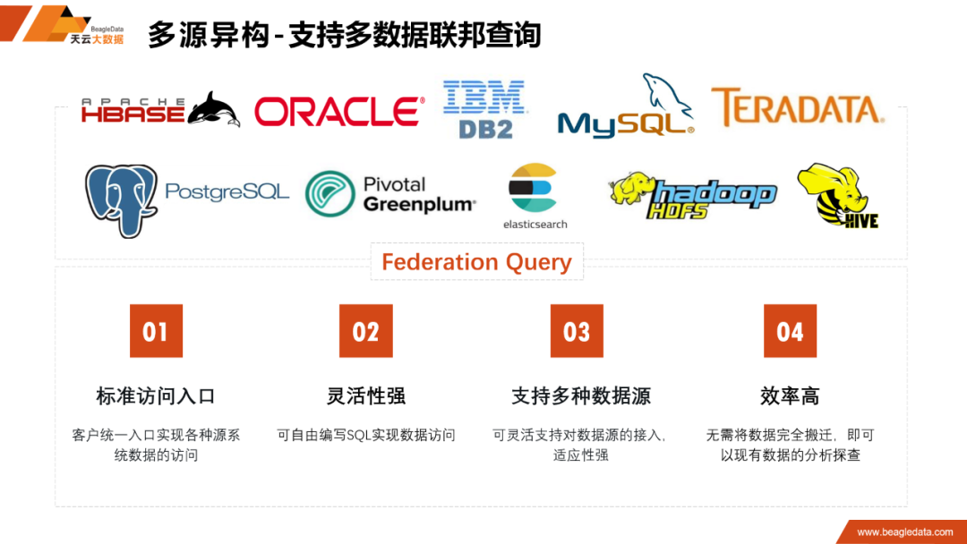 在多源异构方面,PostgreSQL 是通过 FDW 支持多源异构,可访问 Oracle、PG、MySQL、MongoDB 等,对 Hadoop 体系和 NoSQL 支持力度低,效率和性能也较难做到极致。