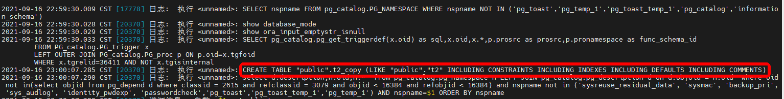 CREATE TABLE "public".t2_copy (LIKE "public"."t2" INCLUDING CONSTRAINTS INCLUDING INDEXES INCLUDING DEFAULTS INCLUDING COMMENTS)3.查看日志信息