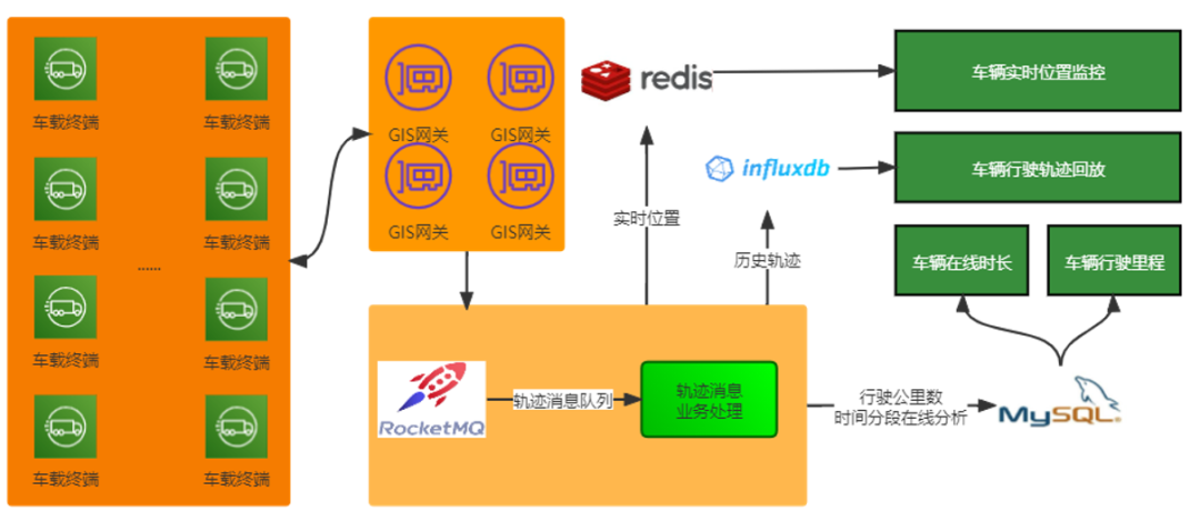 车辆轨迹定位监控项目旨在通过车辆的轨迹监管、异常预警、历史轨迹回放,达成对车辆的统一监管、轨迹追踪、大数据分析及可视化应用等目的。该项目现已对数万台车辆经过车载定位设备上报定位数据至GIS网关服务,服务解析报文下发至消息队列,应用再将定位数据写入InfluxDB,最新车辆位置信息写入Redis,为客户提供车辆实时位置跟踪和历史轨迹回放等查询分析服务。