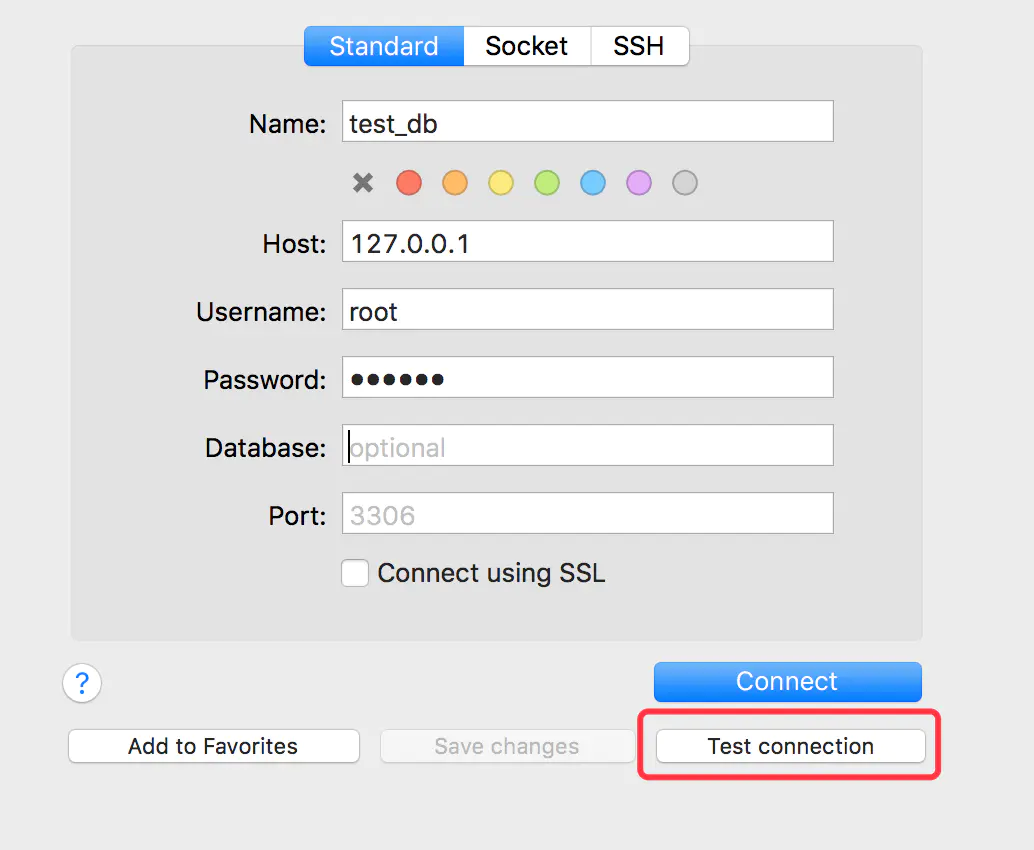 Add to Favorites:把这个连接的信息存放到左侧的“FAVORITES”栏,方便下次连接。 Save changes:如果你已经有连接了,但是想修改连接设置,改完了就能点这个选项了。 Test Connection:测试连接,这个功能很贴心,在正式连接前可以先测试连接是否成功。