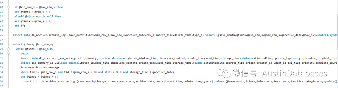 select @min_row_s := min(tid) from msgcdb.t_sms_message; #获取当前系统最小的TID号