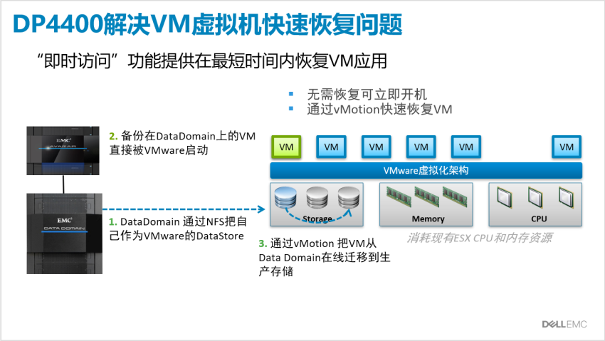它可以将备份集中的VM虚机镜像,通过NFS协议挂载给你的ESXI主机,然后直接拉起测试。一个虚机仅需数十秒的时间即可成功拉起完成。这样即使主SAN存储还没修复,你的工资系统仍然可以马上重新上线测试并恢复运转。