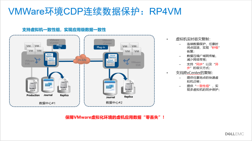 “哪能忘了这个茬呢?!咱们当初做方案的时候就充分考虑过这个问题了。”DP4400一体机方案集成了5个VM虚机的RP4VM(Recoverpoint for vmware)许可。它是VMware平台的CDP连续数据保护大杀器,就像是时光机一样能够穿越到VM虚机之前的任意时间点状态。RPO要等于几,还不是你想咋算就咋算呢?基本上就是一道送分题!咱们当时挑出5个最重要的虚机,可是都已经部署好了哦。