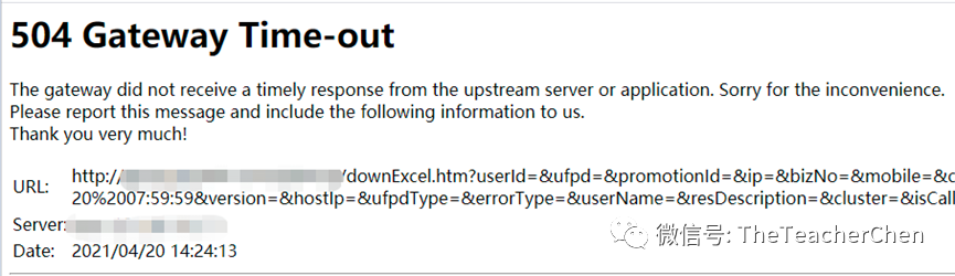 用户从浏览器页面发起数据请求,提交请求后约 60s 后返回 504 Gateway Time-out 。错误页面如下图所示: