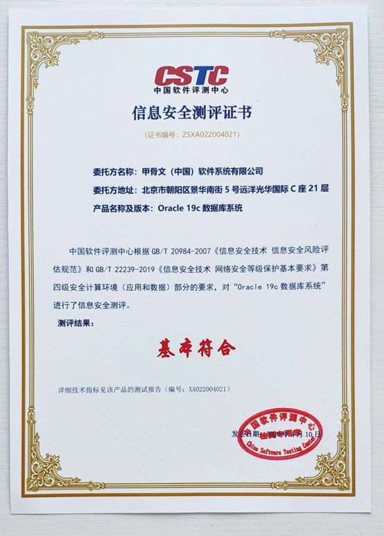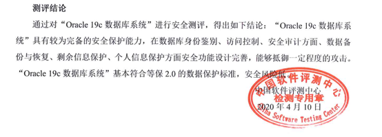 评测机构给与的测评结论:“Oracle 19c 数据库系统”具有较为完备的安全保护能力,在数据库身份鉴别、访问控制、安全审计方面、数据备份与恢复、剩余信息保护、个人信息保护方面安全功能设计完善,能够抵御一定程度的攻击。“Oracle 19c 数据库系统”基本符合等保 2.0 的数据保护标准,安全风险低。
