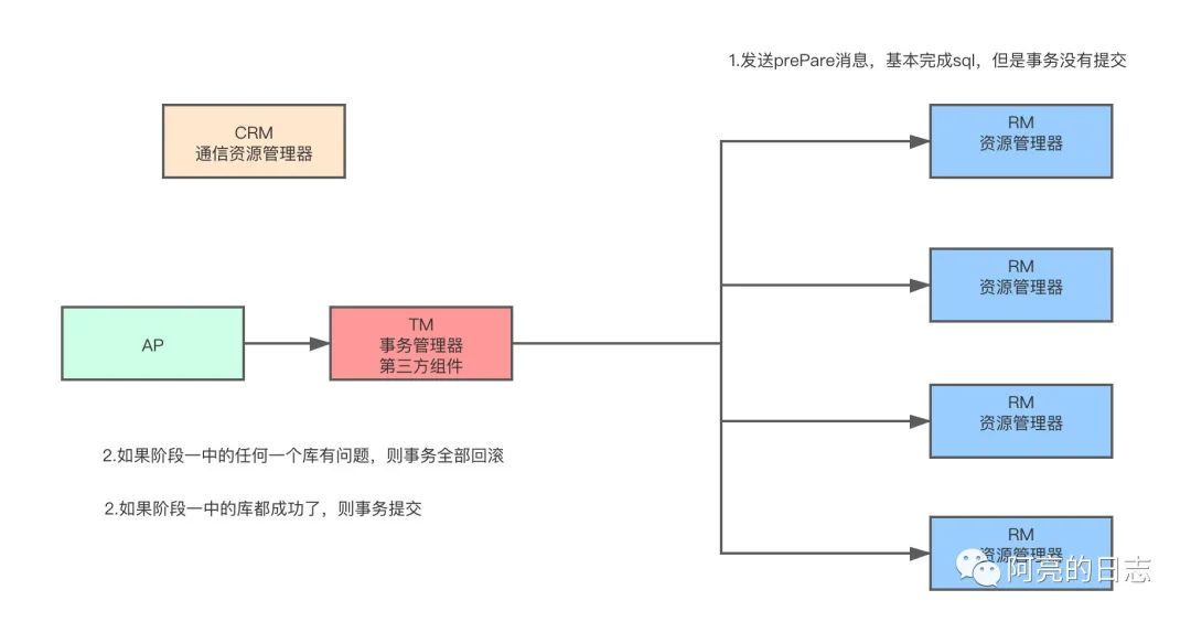 AP: 应用程序,如流量充值系统 CRM: 通信资源管理器,一般是消息队列中间件来实现 TM:事务管理器,一个第三方组件 RM:资源管理器,即mysql客户端,jdbc