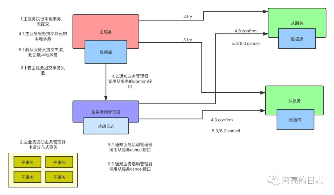 Try:该阶段是对要执行服务的资源进行检查并锁定 Confirm:该阶段是对访问进行实际的操作,会将上一阶段锁定的资源变更为使用 Cancel:该节点是进行事务的回滚,即任意业务逻辑执行失败,都会将try阶段锁定的资源或者数据恢复到初始状态。