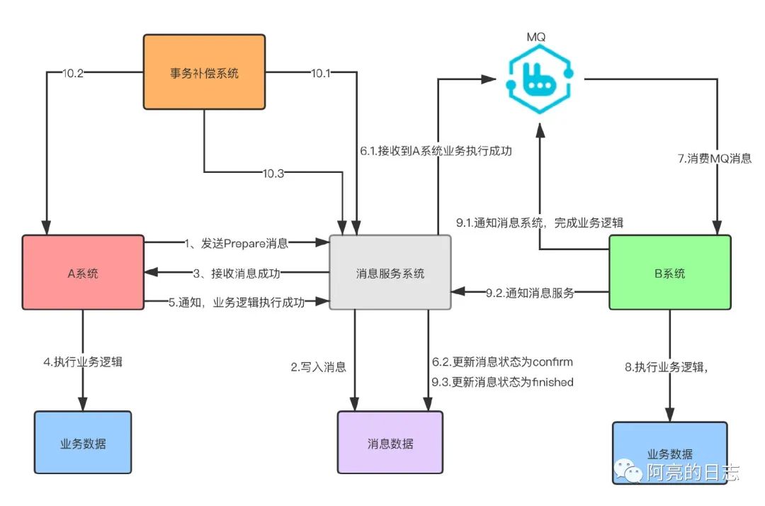 消息到消息服务的库中3.消息服务返回接收消息成功给A系统 4.若步骤3成功,则A系统继续执行业务操作,否则结束 5.A执行业务逻辑成功后,通知消息系统 6.消息系统接收到消息之后,发送消息到MQ,更新消息状态 Prepared
