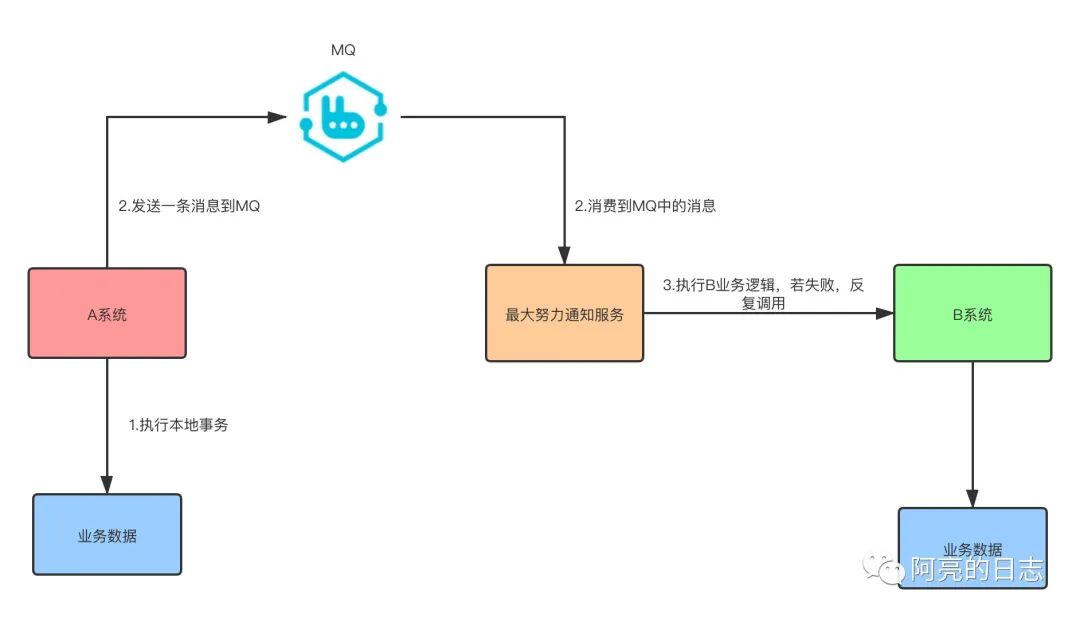 1.A系统执行本地事务 2.本地事务执行成功,写一条消息到MQ中,然后 最大努力通知服务