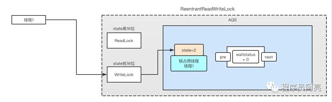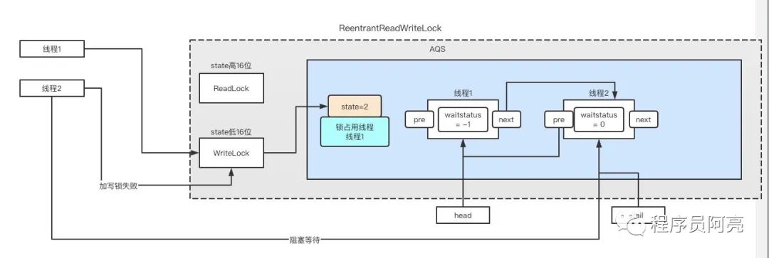 线程1加了写锁,Node的waitestatus=-1,当前低16位因为线程1加了两次锁,state=2,锁占用的线程是线程1。head=tail=线程1的node 线程2请求加写锁,此时加锁失败,会在tail后面拼接一个新的node,waiteStatus=0