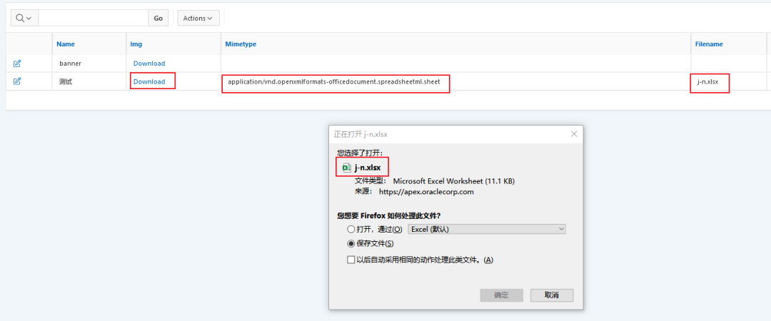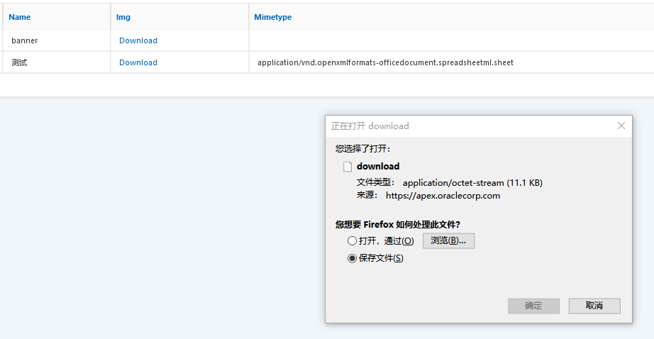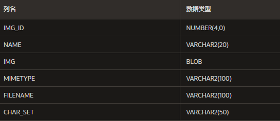 如果想把文件保存在数据库里,并且可以正确下载。光有BLOB字段是不行的。还需要有字段记录文件的MIME类型,文件名,字符集(可选)。如果是图片的话以上三个类型可不需要。我们先建一个表如下。其中MIMETYPE字段不能太短,建议不少于100。