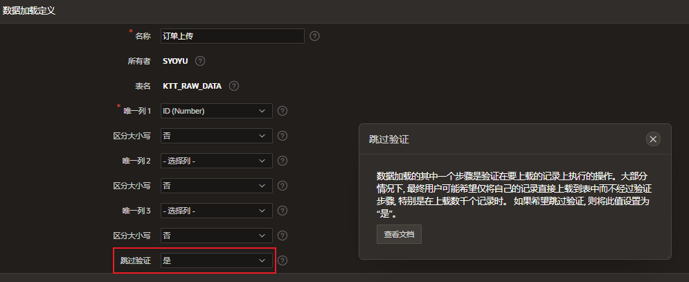 在共享组件->数据加载定义里对打开“跳过验证”的开关。