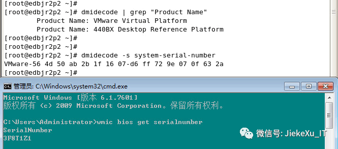 [root@edbjr2p2 ~]# dmidecode | grep "Product Name"Product Name: VMware Virtual PlatformProduct Name: 440BX Desktop Reference Platform[root@edbjr2p2 ~]#[root@edbjr2p2 ~]#[root@edbjr2p2 ~]# dmidecode -s system-serial-numberVMware-56 4d 50 ab 2b 1f 16 07-d6 ff 72 9e 07 0f 63 2a[root@edbjr2p2 ~]#