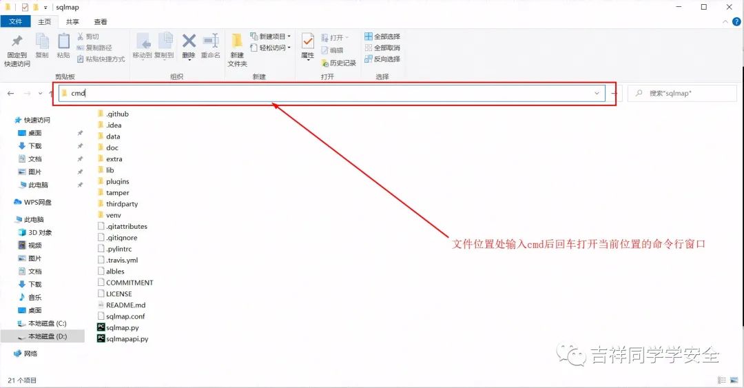 下载完成后进行解压,解压完成后打开文件,在文件位置处输入cmd打开命令行窗口。