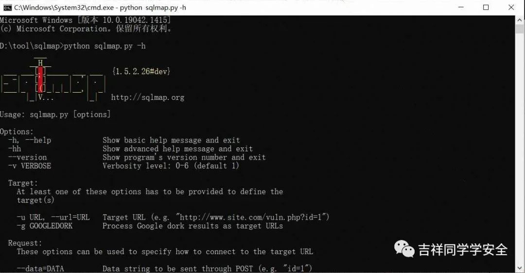 在命令行窗口输入 python sqlmap.py -h,如果回显如下图所示,则代表命令python环境和sqlmap工具已经配置完成。