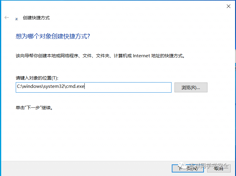 2、在对象位置处输入 C:\windows\system32\cmd.exe