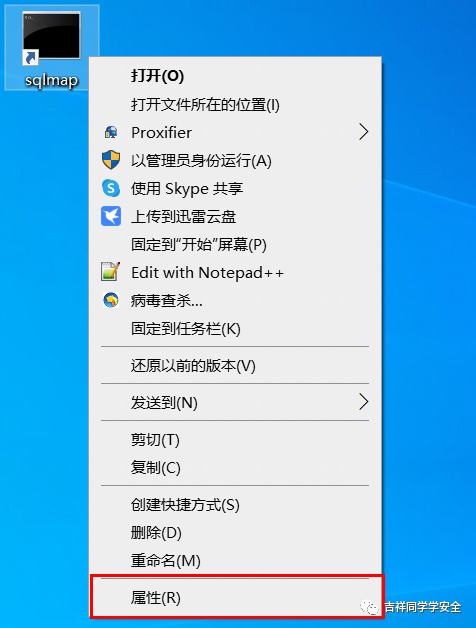 4、点击完成会在左面生成一个名为sqlmap的快捷方式,右键快件方式图标点击属性。