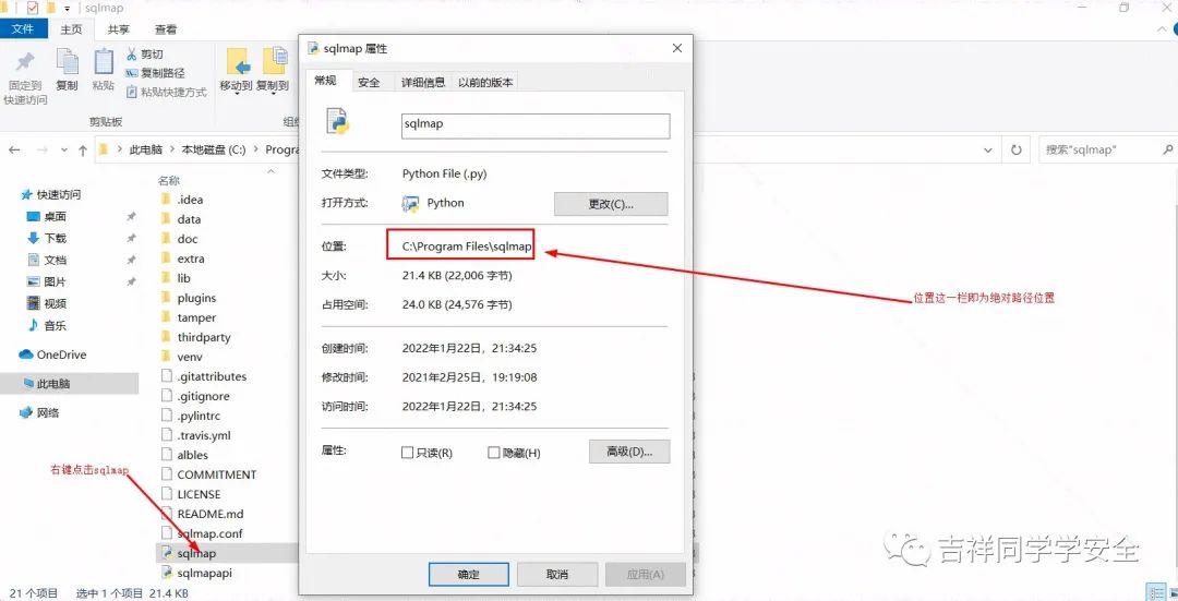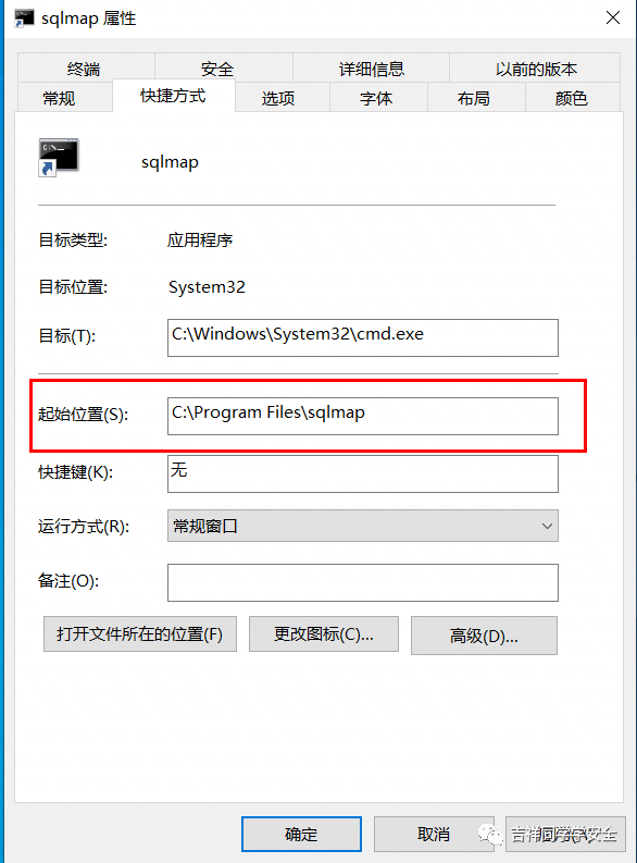 5、在起始位置处输入我们sqlmap文件的绝对路径。(注:绝对路径指的是文件所在位置的全路径,找到文件点击属性即可查看)
