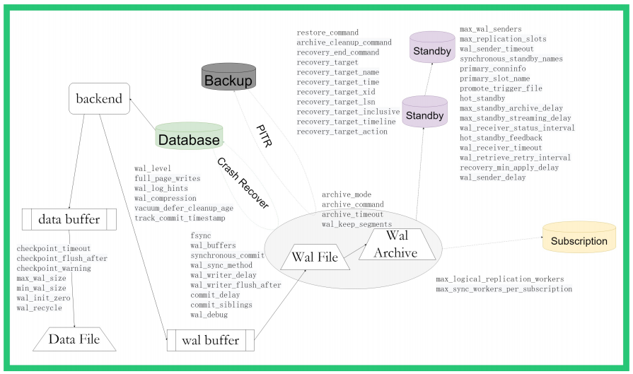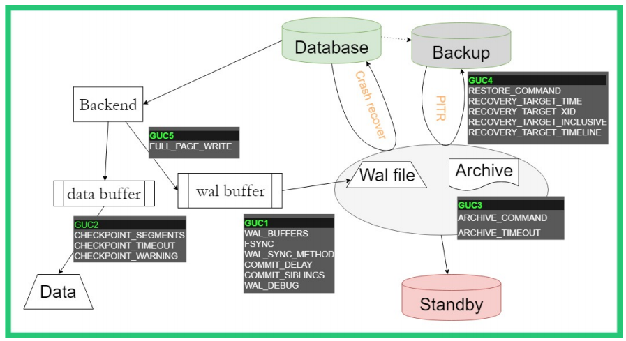 ‘首先要将修改的内容写入wal日志文件’ 在通常的对wal日志的介绍中都会有类似的文字,通常人们对这行文字一笔带过,但就这么一个小小的文字内涵巨大玄机。这个玄机就是PostgreSQL使用了一堆GUC参数来让你控制wal日志写入到磁盘的过程,且看上图中的[GUC1]。