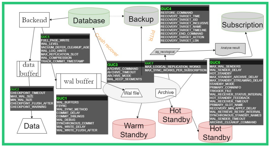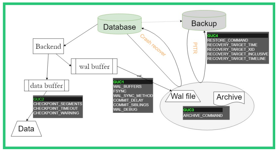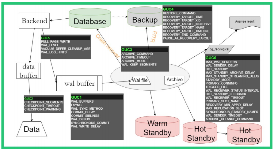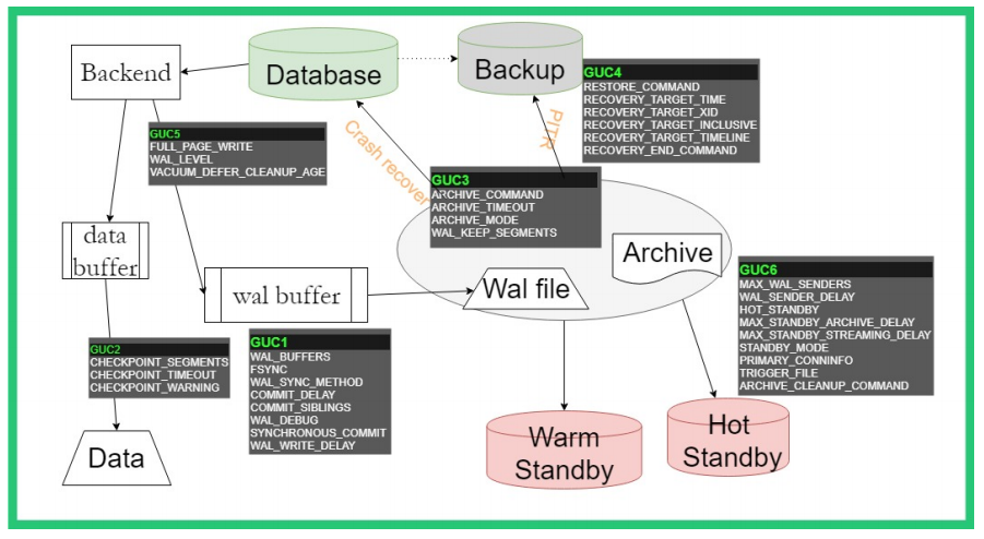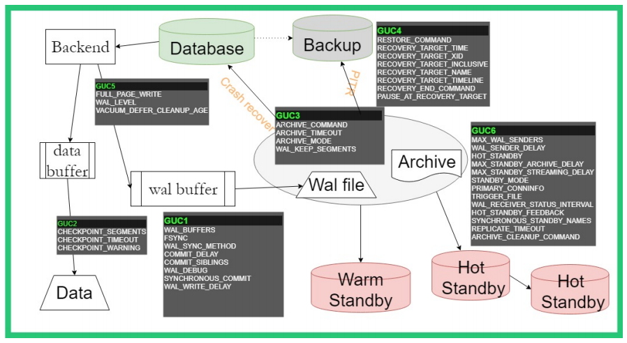PITR的基本原理是,从基础备份的checkpoint点开始,对之后的wal日志进行重演,因此PostgreSQL需要保存基础备份之后所有的wal日志。如图中[GUC3]记录了wal日志归档相关的GUC参数。