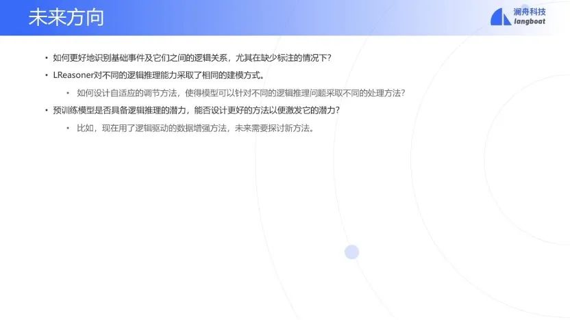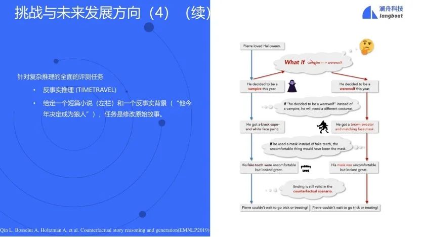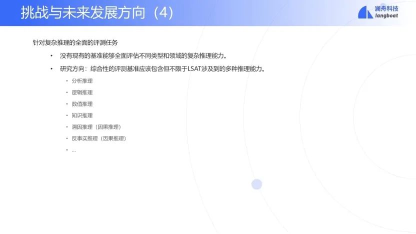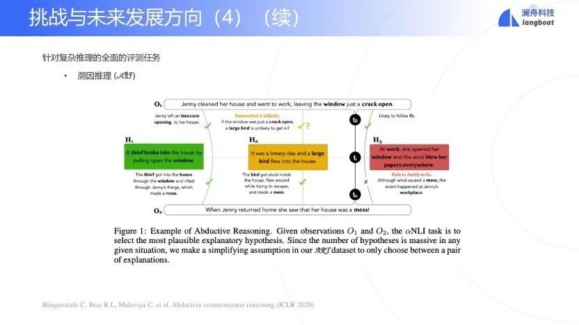 最后,需要构建一个全面的评测集合。现有数据集合每一个可以深入评测复杂推理的各项主要能力。可以建立一个全面评测复杂推理的评测集合,将现有的其他评测任务可以纳入进来。比如常识推理、多跳关系和数据计算等集合。其他很少被研究的复杂推理能力,也应该予以考虑,如反事实推理,溯因推理等等。