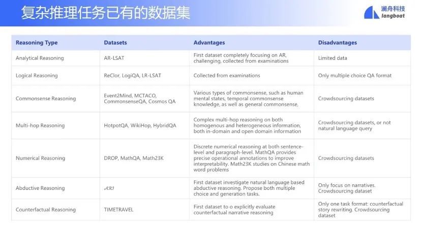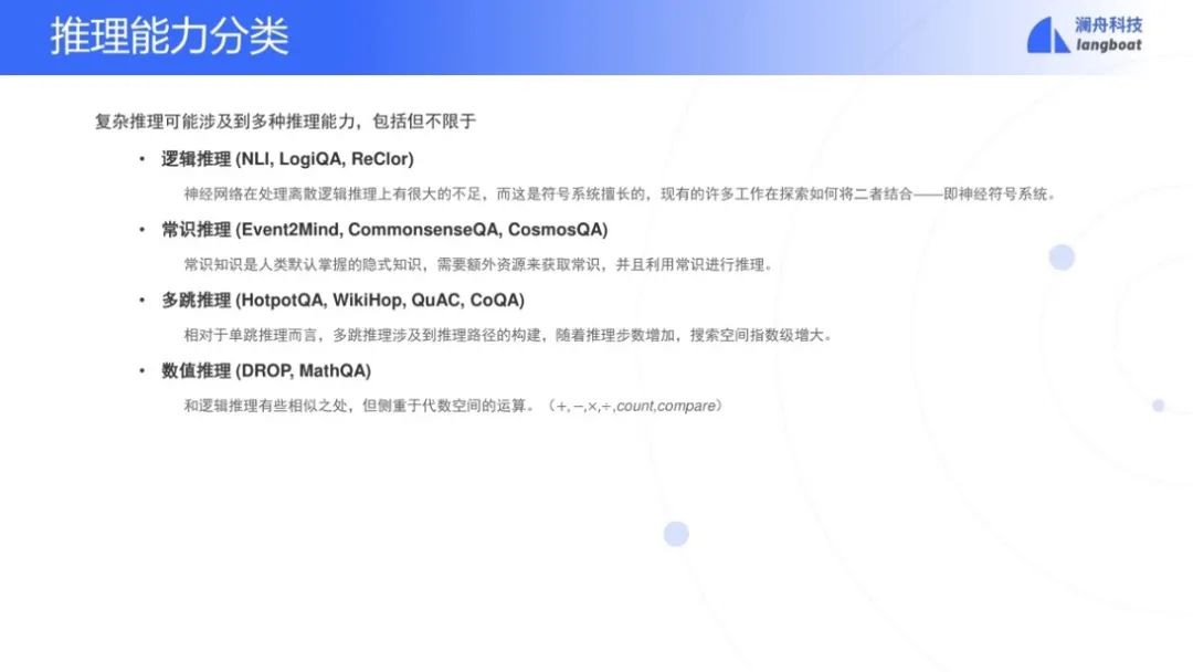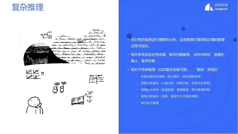 首先是复杂推理,是指理解和分析已有的信息,应用推理机制期望得到正确的推理。复杂推理有十分广泛的应用空间,如解数学题,客服和医学诊断等等。