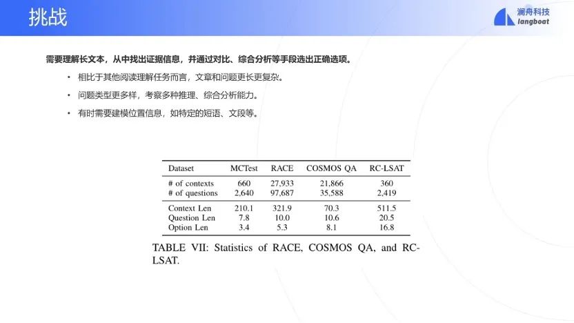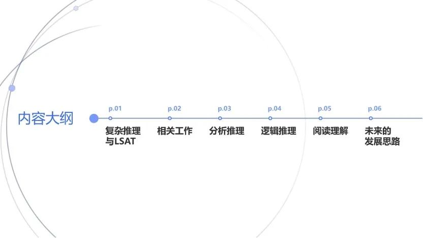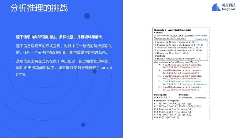 分析推理(AR)。首先给出一个上下文。例如:有七个主任,ABCDEFG,要分配到两个委员会X,Y中。分配的时候要满足6个约束条件。比如说,如果A在X委员会,则B就得在Y委员会,等等。然后问题是:如果D和F都在Y委员会的话,则如下5个可能选择,哪一个有可能是正确的? 逻辑推理(LR)。也是先给一个上下文。例如:如果你不会用键盘,则不会用电脑;你不会用电脑,则你不会用词处理系统写文章。那么问题来了,如果这个上下文的说法是对的,那么下面哪一个逻辑推理是对的?比如第一个选项: 如果你有一些用键盘的技巧,你就能够用词处理系统写文章;显然选项一的推理是有问题。 阅读理解 (RC)。给一个文章作为上下文,抛出一个问题,选择一个合乎上下文的。