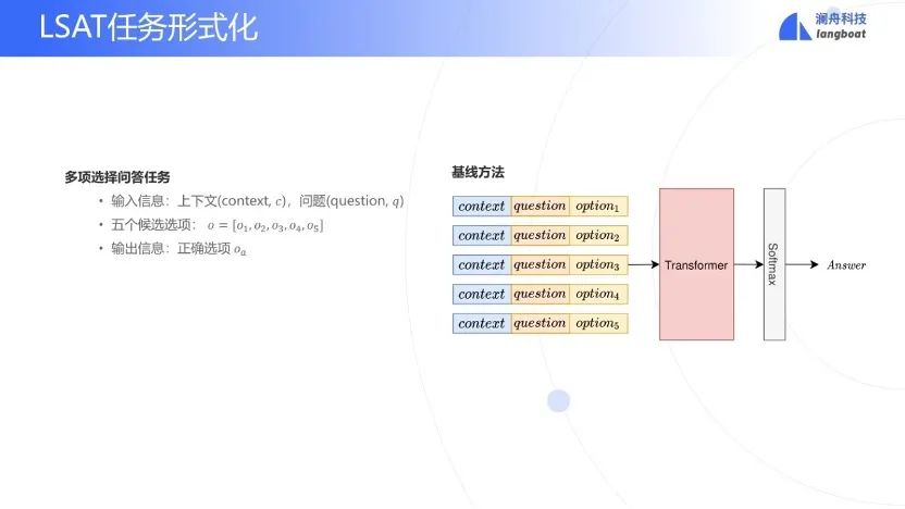 LSAT的任务,概括而言,就是一个多选QA任务。根据上下文和问题选择最佳的答案。那么可以设计这样一个baseline的方法,即上下文c,与问题q和一个选项o拼起来。把所有的选择拼的结果,都送到一个transformer中,然后输出层加一个softmax,得到每一个选择的概率,然而这种方法在LSAT任务中准确度很低。