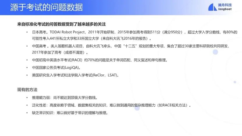 基于考试的问答中,日本大学入学考试,中国高考的各科考试等,现有的方法尚不达到进入顶级大学的分数线。而这些任务面临通用的常识推理,基于常识的阅读理解的短板,并且需要对每一个科目编码相关知识。
