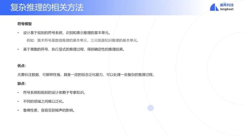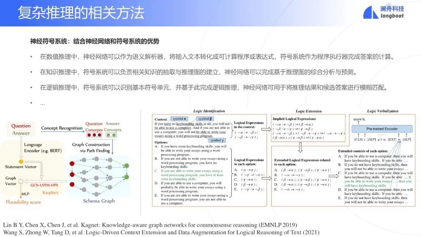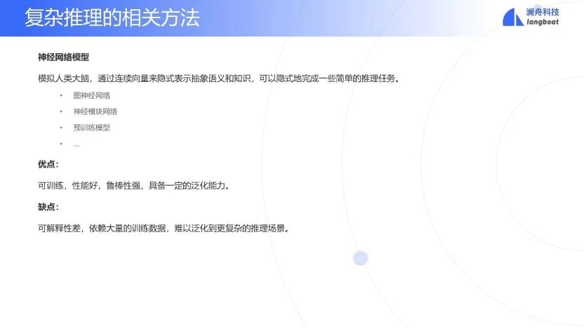 使用神经网络模型,譬如预训练模型、图模型是另一种解决复杂推理的方法。它体现的是隐式的推理。优点是对噪音数据鲁棒性。不需要写繁琐规则。端对端训练。缺点是缺乏可解释性,需要依赖足够的训练数据(通常没有足够的标注数据),训练的计算代价大。