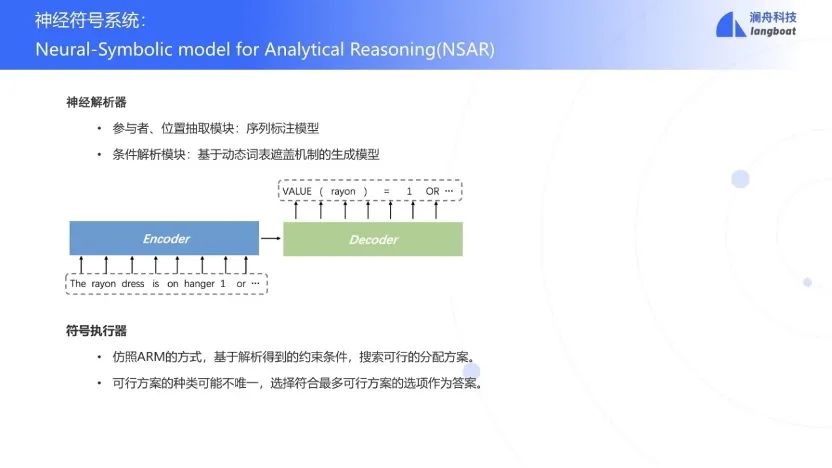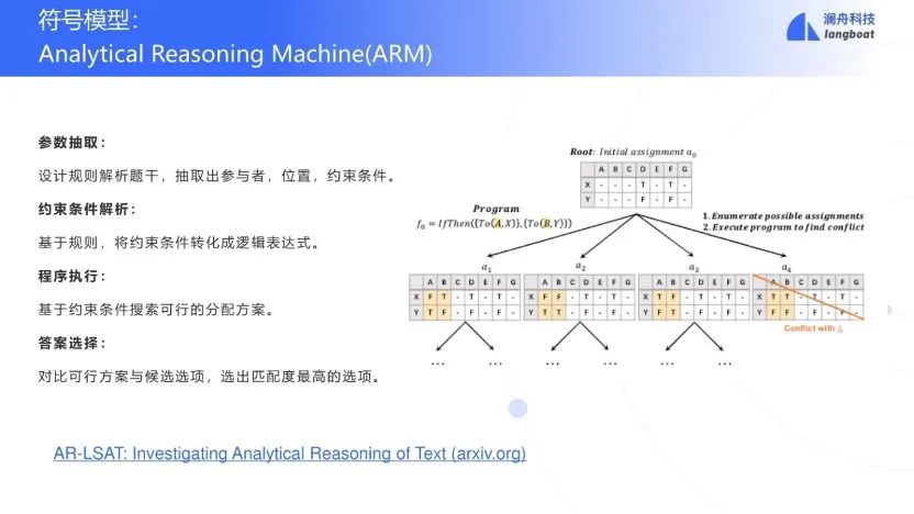 目前已经完成了一个符号系统求解这个AR问题,称之为ARM(分析推理机)[6]。首先要用NER和规则抽取论元:参与者(participant)、位置(position)和约束条件。随后利用parser将约束条件转换为程序,用执行器执行所有程序,产生一组合理的分配。最后再决定哪一个选项满足的这个合理的分配。