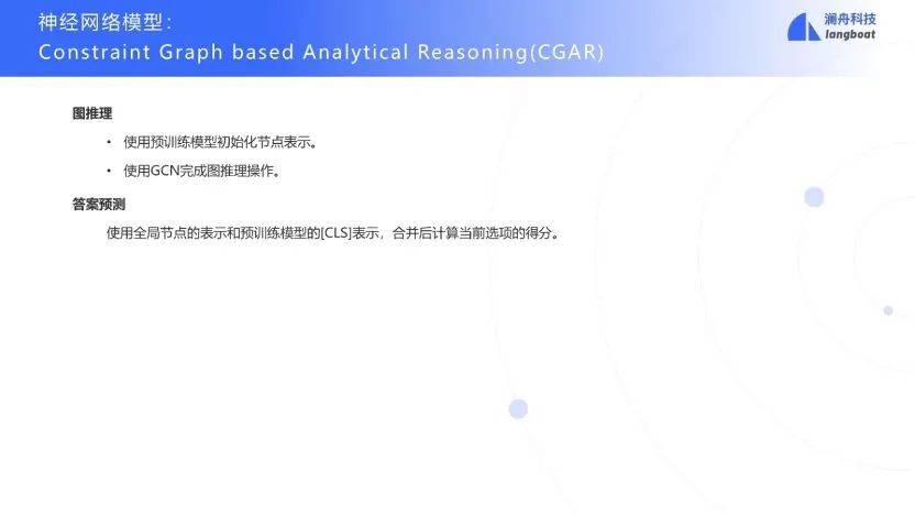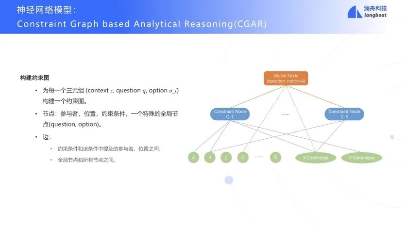 此外还设计了一个神经模块CGAR来简化ARM的人工代价。考虑到问题解决participant和position之间的约束关系,为了建模他们之间的关系结构,提出了构建约束图。这是一个异构无向图, 基于问题q,选项o构建全局节点,和所有约束条件节点链接,表示答案是否满足所有约束。