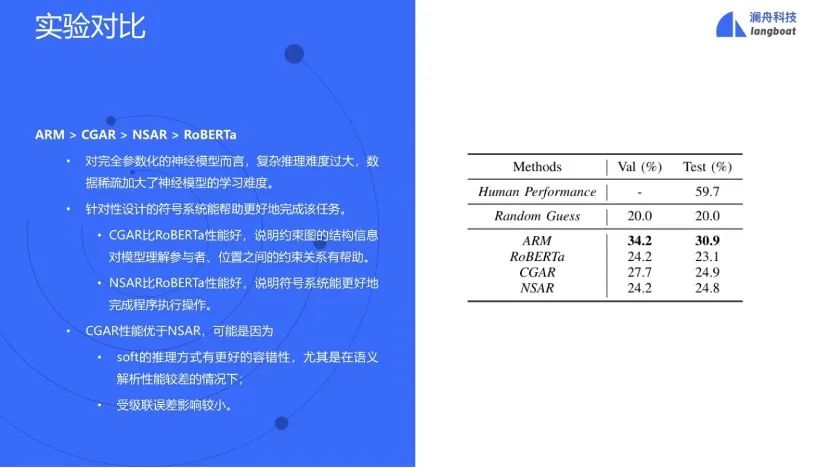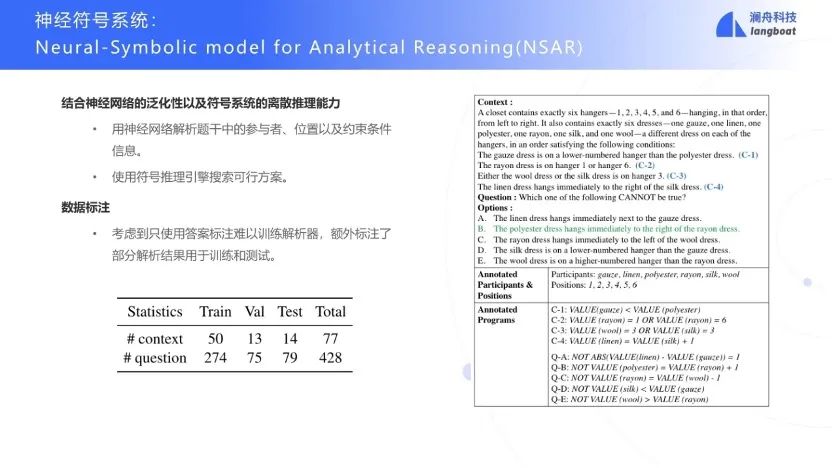 针对AR问题,研究了符号模型、神经模型和混合模型。取得了比baseline好很多的结果。但是水准200名以外,说明还有很大差距。 针对LR问题,研究了神经-符号模型。用逻辑驱动扩展context和数据增强。 RC问题,研究了标注位置信息的对偶是多头共同注意力模型。基于预训练模型用RACE数据做模型迁移学习。