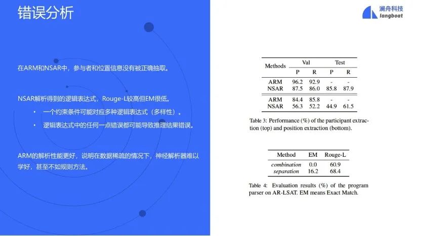 所有导致错误的情况中,有一小部分是由于participant和position没有抽取正确。此外,NSAR产生的program的rouge-L分数不低,但是精准匹配分数低。而program中只要有一点错误就会导致无法执行,或者产生错误结果,因此对于精确匹配的要求非常高。
