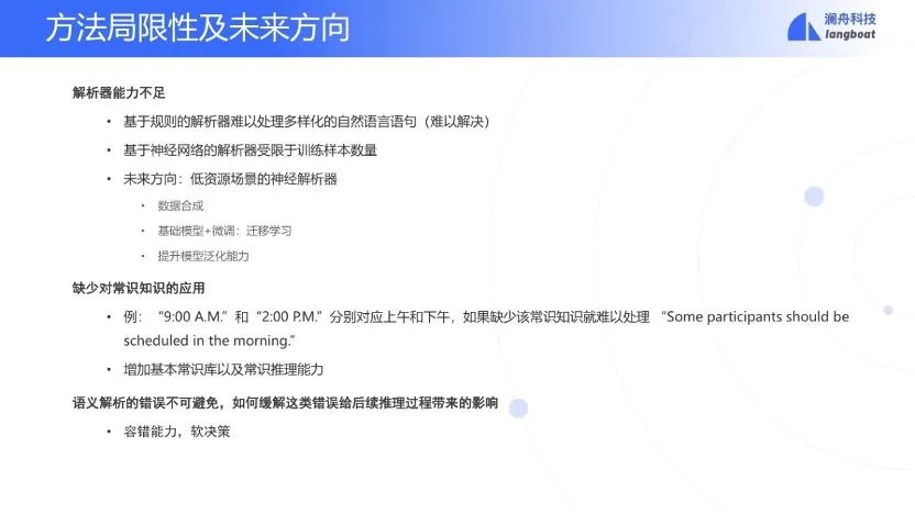 以上的方法也有一些局限性,比如基于规则难以处理多样化的自然语言,而神经网络又依赖训练数据的数量,还有常识在模型中的缺失等等,因此未来的方向就在于如何在低资源场景下训练一个可靠的神经解析器,并且应用软推理来减少语义解析错误的影响,增加整个流程的鲁棒性。
