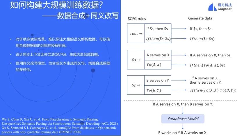 在数据缺失的情况下,可以用同步上下文无关语法SCFG来合成大量数据,即用CFG生成program的同时也生成对应的自然语言,再用同义改写(Paraphrasing)来增加数据的多样性[7, 8]。