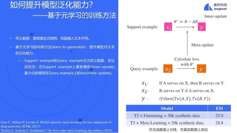 为了让模型能够在合成数据上也具有泛化性,采用元学习的训练方法[10, 11],让模型在同义语句上的loss尽可能相同。