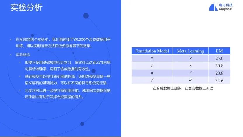 根据以上两种方法设计的四组实验可以看到,仅用合成数据能达到25%的精确匹配,说明的确有效果,foundation model和元学习能进一步提升模型的结果,也证明了这些方法的有效性。