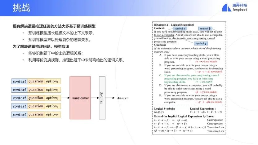 。然后利用逻辑公式做各种等价扩展。同时对选项也同样抽取逻辑单元和逻辑表达式,并增补进来。最后把这些增补的逻辑表达式转换为文字序列,用于答案匹配。