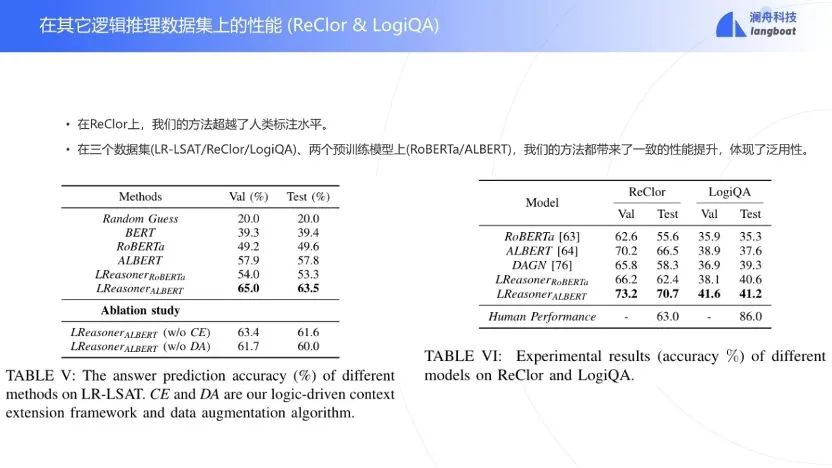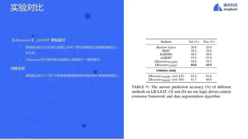 与简单地用预训练模型,如BERT, RoBERTa,ALBERT等比较,LReasoner表现最佳,通过消融实验说明逻辑扩展和数据增强都对模型有很大的帮助。