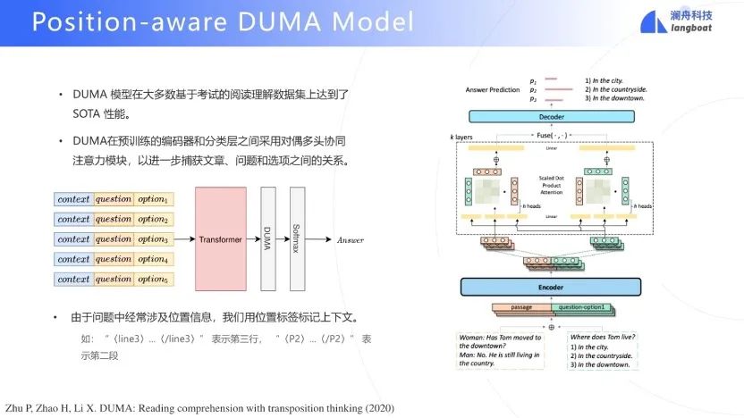 根据LSAT-RC的特点提出了position-aware的DUMA模型[13],其中DUMA指对偶多头互注意力模型。DUMA模型在LSAT-RC类型题目上是SOTA模型。基本原理是将上下文、问题、option合并在一起,多个option,多输入。经过一个DUMA层,使得context和option相互注意力。由于LSAT中会提问关于文本位置(如第xx行)的问题,在输入中加上了位置信息。