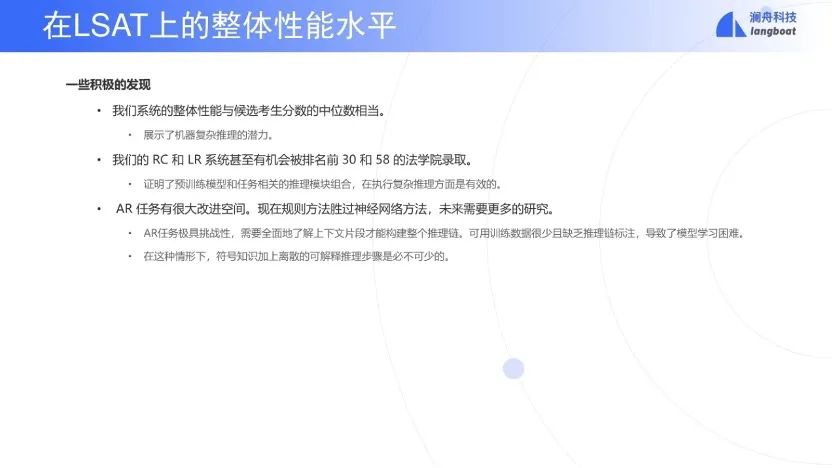 系统取得了不错的结果:LSAT的平均水准,但存在着很多挑战,如可解释性,few-shot learning,常识推理等等。