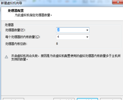 虚拟机 处理器数量 和 每个处理器内核数量 不能超过主机核心数。若超出则会警告提醒。 、