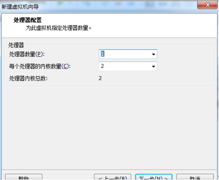 6、处理器配置,可以根据您的系统选择,这里处理器数量选择 1 ,每个处理器内核数量 2。